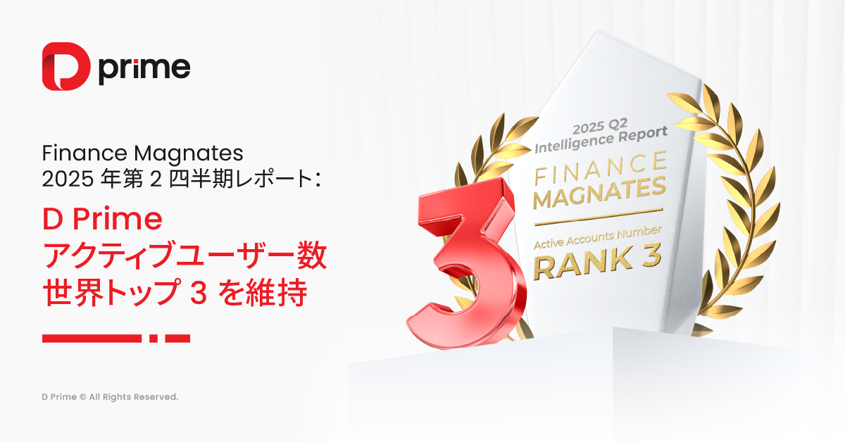 金融業界の権威ある調査機関ファイナンス・マグネイト Finance Magnates) が発表した「2025年第2四半期業界レポート」によると、D Primeのグローバルアクティブユーザー数は16.8万人を突破し、世界トップ3を堅持。そのうえ、1アカウントあたりの月間平均取引額は104万米ドルに達し、世界有数の取引プラットフォームとしての存在感と影響力を改めて示しました。